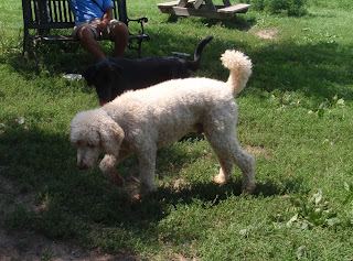 | Black dog chewing on tan dogs tail. Tan dog snarling at Zootee? Zootee smiling - :) |